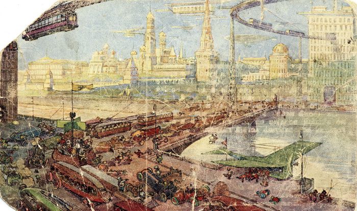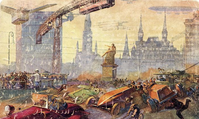 Красная площадь. Шум крыльев, звон трамваев, рожки велосипедистов, сирены автомобилей, треск моторов, крики публики. Минин и Пожарский. Тени дирижаблей. В центре — полицейский с саблей. Робкие пешеходы спасаются на лобном месте. Так будет лет через 200.