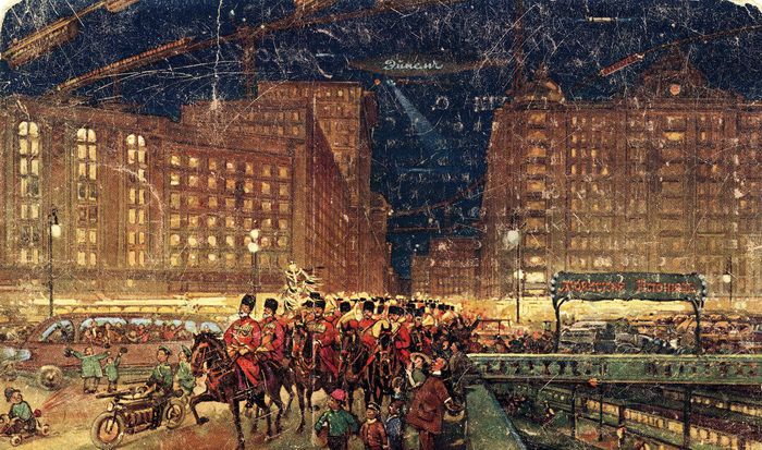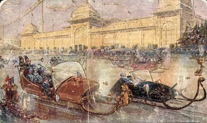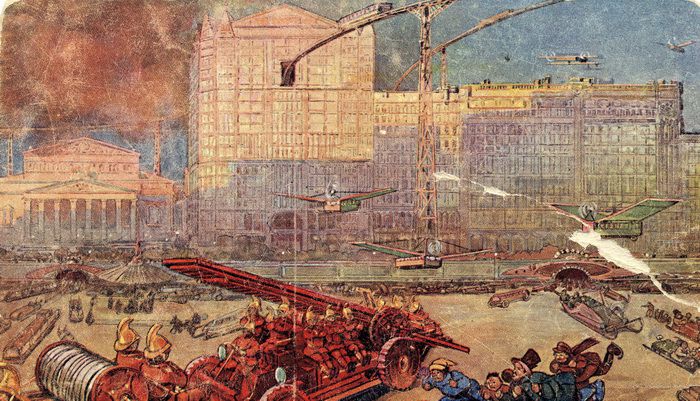 Театральная площадь. Темп жизни усилился в сто раз. Всюду молниеносное движение колесных, крылатых, пропеллерных и прочих аппаратов. Существовавший еще в 1846 году Торговый дом Мюр и Мерлиз в настоящее время разросся до баснословных размеров, причем главные отделы его соединены с воздушными железными дорогами. Из-под мостовой вылетают многочисленные моторы. Где-то вдали пожар. Мы видим автомобильную пожарную команду, которая через мгновение прекратит бедствие. На пожар же спешат бипланы, монопланы и множество воздушных пролёток.