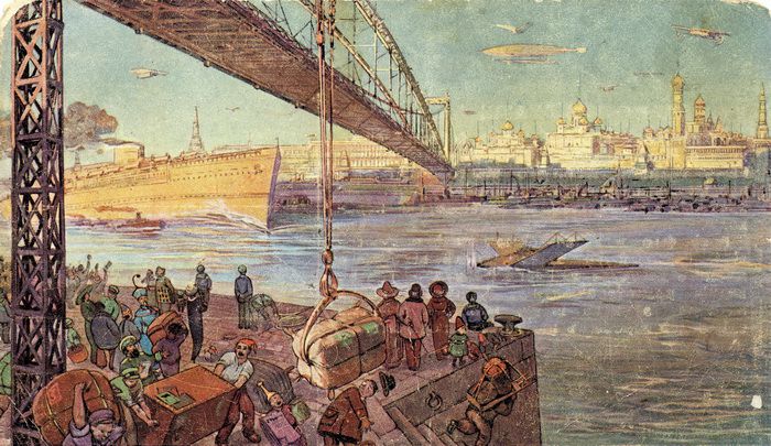 Оживленные, шумные берега большой судоходной Москвы-реки. По прозрачным глубоким волнам широкого торгового порта несутся огромные транспортные и торговые крейсеры и многоэтажные пассажирские пароходы. Весь флот мира — исключительно торговый. Военный упразднен после мирного договора в Гааге. В шумной гавани видны разнохарактерные костюмы всех народов земного шарa, ибо Москва-река сделалась мировым торговым портом.