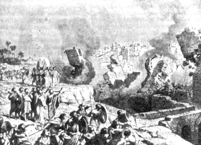 По переходе через реку Иордан, нужно было взять город Иерихон, у которого были очень высокие и крепкие стены. Иисус Навин, по повелению Божию, велел священникам, в предшествии воинов и в сопровождении народа с ковчегом завета, обходить город вокруг в течение семи дней: шесть дней — по одному разу, а в седьмой день обнести ковчег семь раз. После этого стены иерихонские обрушились до основания, при трубном звуке священников и громком восклицании всего народа. И евреи взяли город.