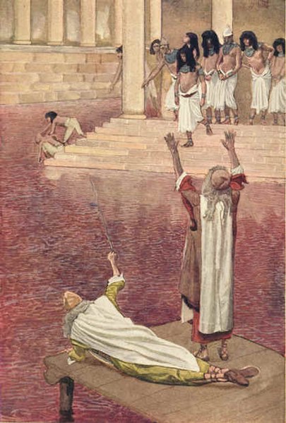 И поднял [Аарон] жезл и ударил по воде речной пред глазами фараона и пред глазами рабов его, и вся вода в реке превратилась в кровь, и рыба в реке вымерла, и река воссмердела, и Египтяне не могли пить воды из реки; и была кровь по всей земле Египетской.