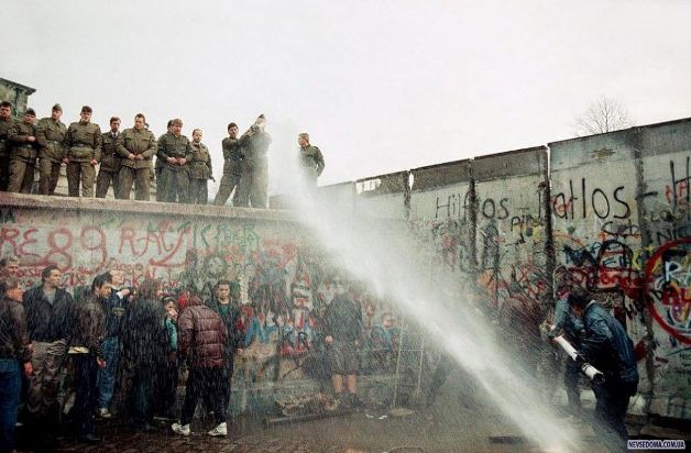 Пограничная служба Восточной Германии использует шланг, чтобы разогнать жителей Западного Берлина недалеко от Бранденбургских ворот в берлине 11 ноября 1989 года