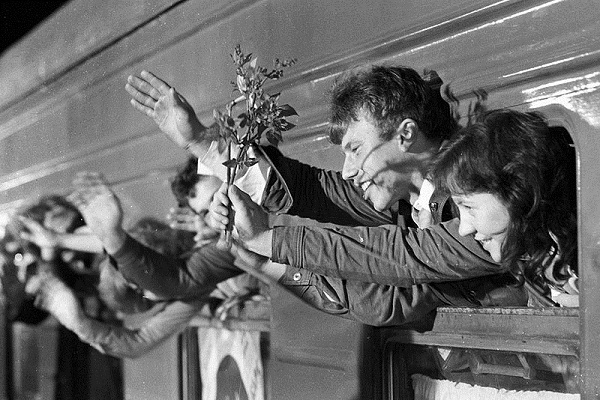Перрон Ярославского вокзала. Московский комсомольский отряд, направляющийся на строительство Байкало-Амурской магистрали
