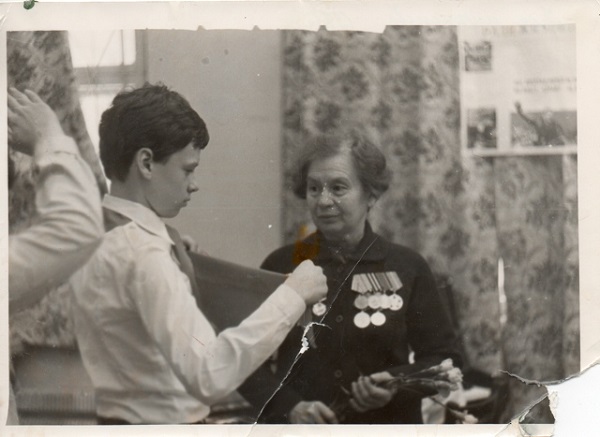 Пионеры школы №651 в Москве на «уроке мужества», посвящённом 40-летию Победы, принимают в почётные пионеры ветеранов ВОВ.