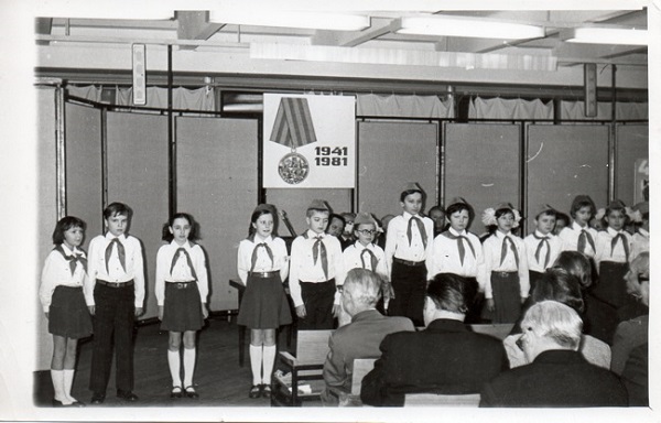Выступление учащихся средней школы № 651 перед ветеранами Великой Отечественной Войны, посвящённое 40-летию обороны Москвы, в здании института Гидропроект. Москва, декабрь 1981 год.