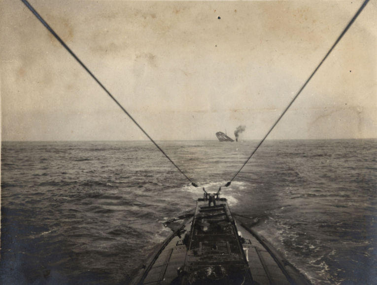 12. Немецкая подводная лодка топит торговое судно союзников в Атлантическом океане, 1915 год.