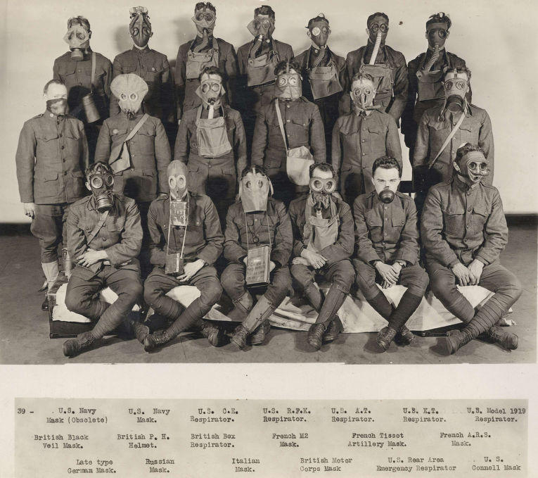4. Американские солдаты в противогазах, используемых в разных странах, в Лаборатории химико-технологических исследований в Филадельфии, 1919 год.