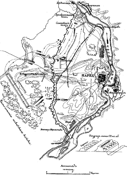 Русские войска заранее построили укрепления, защищающие свои позиции с запада. На левом берегу реки Наровы был возведен двойной земляной вал, концы которого упирались в реку. Расстояние между линиями вала составляло на правом фланге 600 сажен, в центре 120 сажен, а на левом фланге 41—50 сажен. Узость пространства между валами — всего 80 м на левом фланге, которое ещё было застроено бараками для солдат, лишало армию манёвренности.