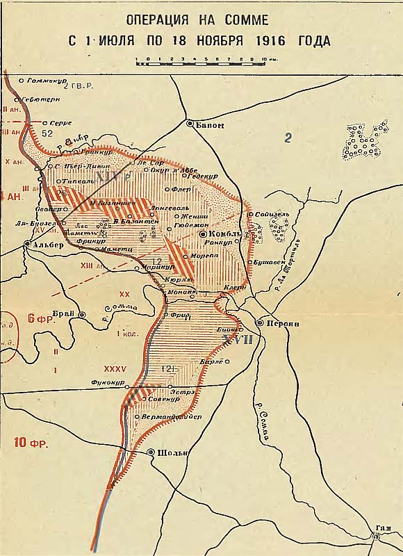Но Верденская операция, истощившая французскую армию, заставила изменить первоначальный план, возложив главную роль в наступлении на Сомме на английскую армию, доведенную уже до 56 дивизий; французские же войска должны были в предполагаемой oneрации играть вспомогательную роль.