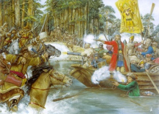 Здесь и произошли первые столкновения с противником. В ходе одного из них в плен был захвачен знатный татарин Таузак, который сообщил Ермаку подробные сведения о Сибирском ханстве и его вооруженных силах. Тогда то казачий предводитель и принял решение идти на столицу Кучума город Кашлый, расположенный на Иртыше в устье Тобола. Первые же бои с татарами продемонстрировали колоссальное превосходство казаков в вооружении. Имевшие на вооружении крупнокалиберные испанские мушкеты, воины Ермака легко рассеивали многочисленные, но плохо обученные и вооруженные татарские отряды.