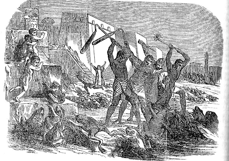 И поднял [Аарон] жезл и ударил по воде речной пред глазами фараона и пред глазами рабов его, и вся вода в реке превратилась в кровь, и рыба в реке вымерла, и река воссмердела, и Египтяне не могли пить воды из реки; и была кровь по всей земле Египетской.