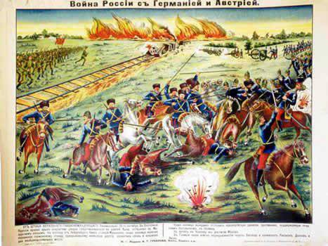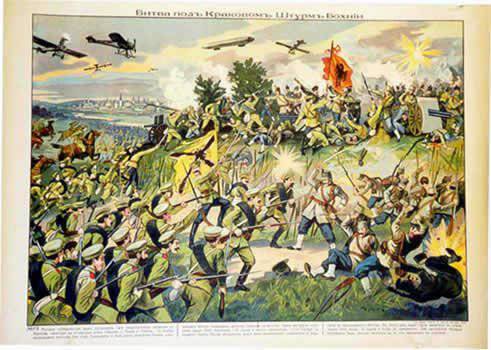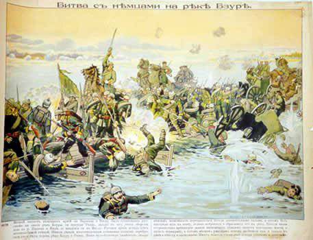 Плакат «Поражение немецких войск у Гумбинена». Гумбинен-Гольдапское сражение 20 августа 1914 г завершилось поражением одной русской и трёх немецких дивизий, русские потеряли 16500 человек, немцы — 14800 человек, в том числе в 17-м корпусе Макензена 10500 человек. Поражение центрального корпуса создавало серьёзную угрозу 8-й армии, и командующий немецкой армией Притвиц отдал приказ об общем отступлении.