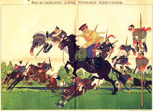 Плакат «Богатырское дело Козьмы Крючкова» В годы Первой мировой войны имя Кузьмы Крючкова было известно всей России. Бравый казак красовался на плакатах и листовках, папиросных пачках и почтовых открытках, его портреты и рисунки, изображающие его подвиг, печатали в газетах и журналах. А отличился казак в первые дни войны в бою с немецкими кавалеристами недалеко от польского городка Кальвария.